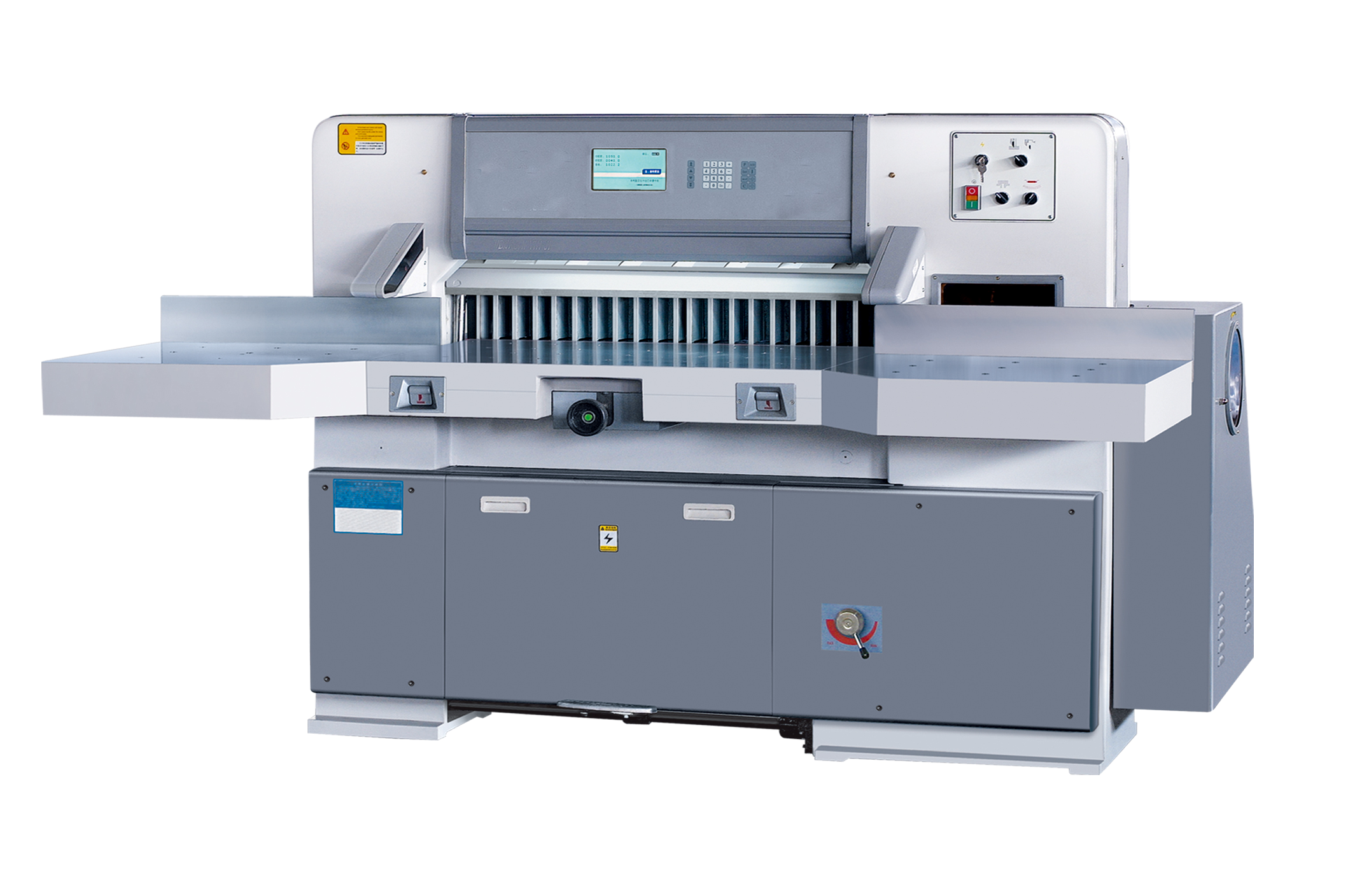 This machine is with 7 inch computer and the computer have 30 groups program and each program has 126 cutting capacity. The paper pusher is driven by LG converter and the speed of paper pusher can reach 10 meters per minute. The clamp is driven by hydraulic system and the clamp pressing pressure can be adjusted according to different type of paper. We use SIEMENS AC contractor, Toshiba Bridge Rectifier, Omron PLC, Schneider Travel Switch and LG Air Switch. This machine is combined with program function and at price level of digital display paper cutting machine. It is very suitable for small and medium scale printing and packing enterprise. The password can be set in advance. When this machine is used for some time, the computer will be locked and after final customer clear all payment then clear password. It can lower the reseller’ business risk